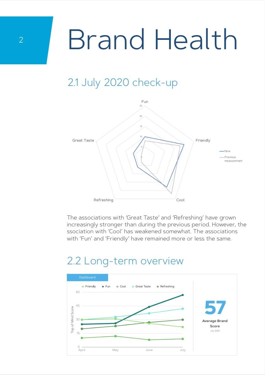 Brand health: Brand-attribute association (e.g., ‘Coca Cola’ and ‘Happiness’). This can be conducted at a regular time interval, or as a pre- and post campaign test.