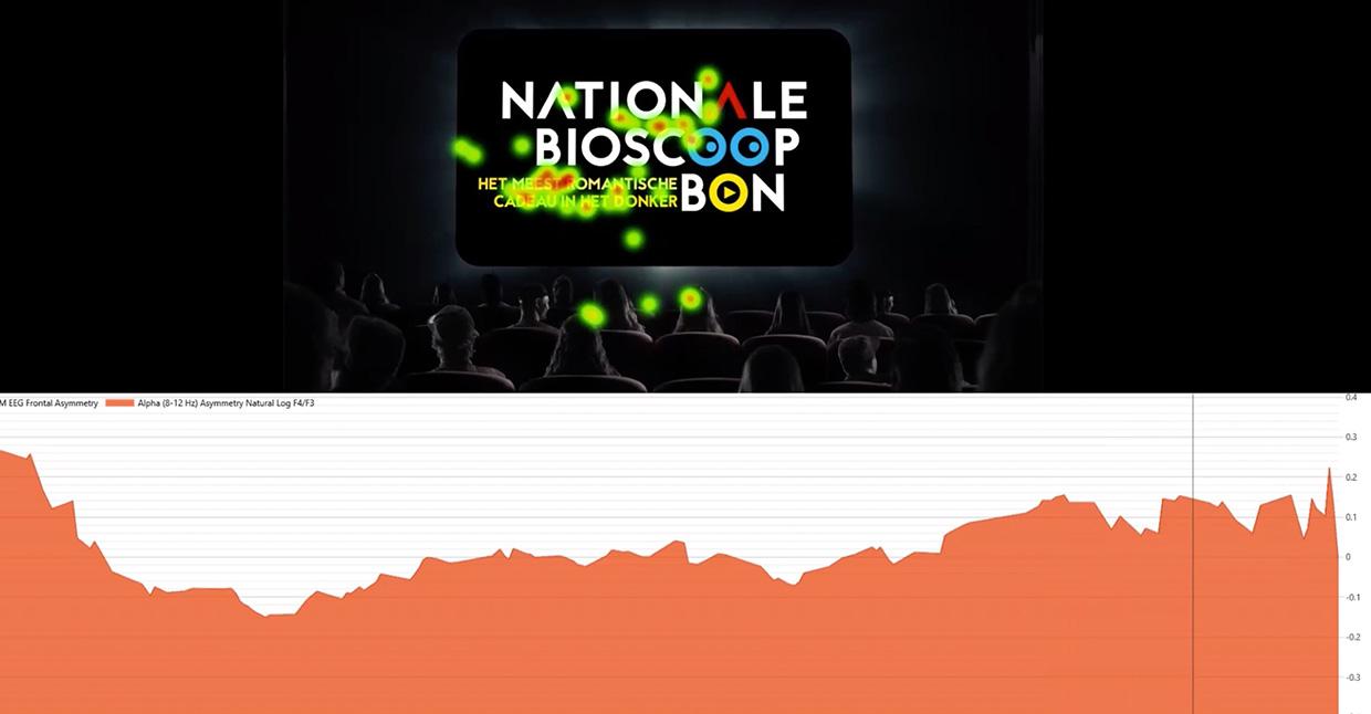 De breindata laat zien dat de Bioscoopbon reclames hier goed in slagen. De emotie is bij 4 van de 5 reclames positief, en de workload (activatie van het werkgeheugen) is relatief laag. Dit is een optimale conditie waarin het bedrijf ‘op de automatische piloot’ positieve emotie aan het merk koppelt. Men zal de reclame of de bioscoopbon weliswaar niet actief gaan herinneren, maar het merk zal wél stijgen op de aantrekkelijkheidsladder in het brein!