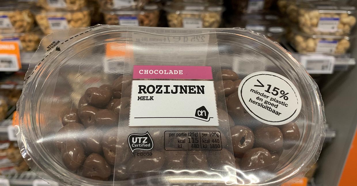 Dit effect speelt natuurlijk ook op bij het lezen van de verpakking van de met chocolade omhulde rozijntjes. Juist het benadrukken dat de verpakking minder plastic bevat, zorgt ervoor dat we met een kritische duurzaamheidsbril naar de verpakking gaan kijken.