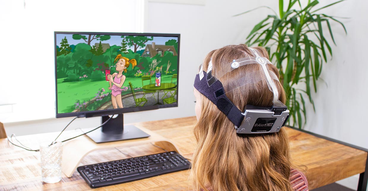 While an eye tracker follows her eye movements, the EEG headset automatically measures her brainwaves. These provide insight into the emotional highs and lows when watching a commercial. Combine these with the eye tracking, and you know from millisecond to millisecond exactly where people are looking and what feeling that produces. And that turns out to reveal a lot about the later impact of the commercial on brand preference and buying behaviour – also for advertising concepts!