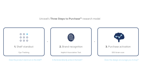 Three simple words. Three critical challenges. Every product and packaging design which makes it to the check-out owes this to its own ability to stand out, being able to activate the brand and excite. Unravel’s Neuro Packaging research is based on this Three Steps to Purchase model.