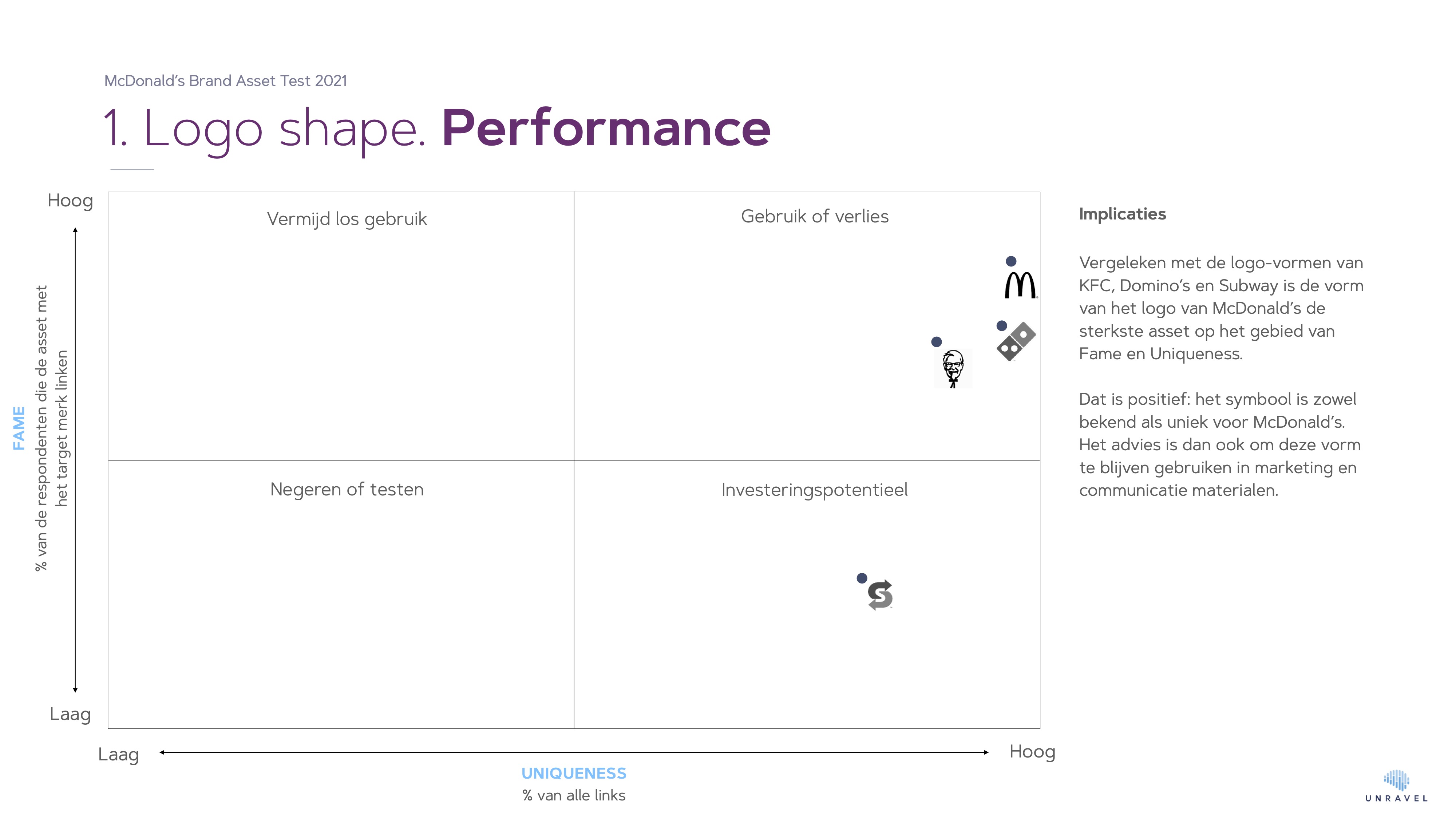 Unravel's Brand Asset Monitor controleert de kracht van jouw brand assets op hun Fame (% consumenten dat de asset aan het merk koppelt) en Uniqueness (de mate waarin de asset aan jouw merk linkt, en niet aan concurrenten).