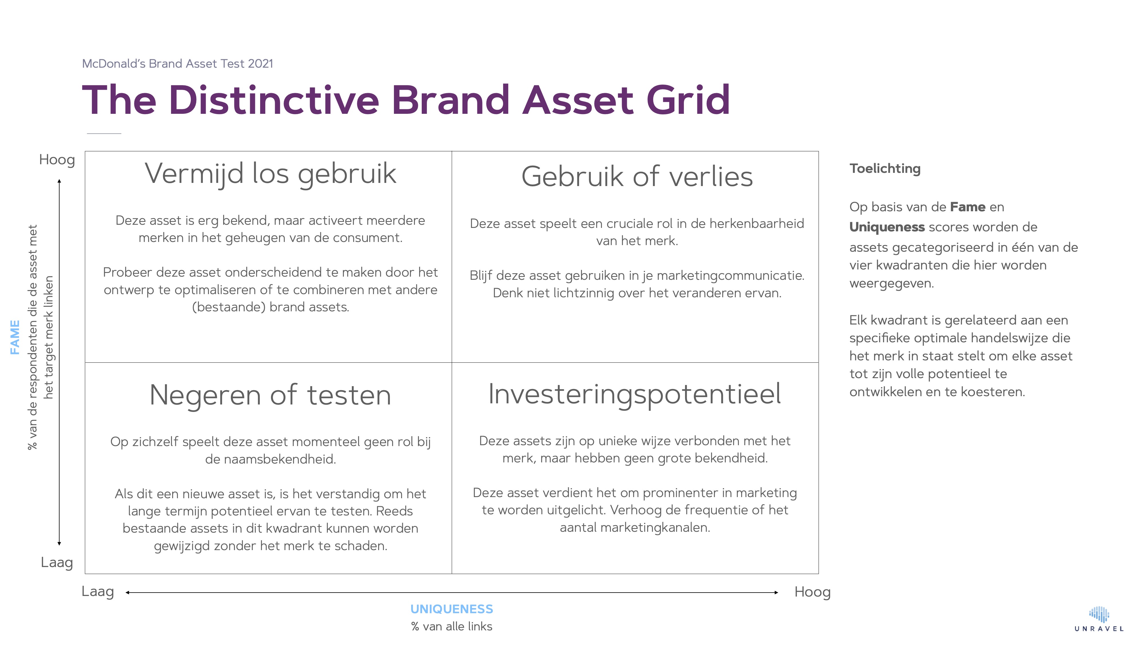 De resultaten van een brand asset test zijn zeer praktisch en geven direct strategische richting. Op basis van hun prestaties op Fame and Uniqueness, wordt elke asset gecategoriseerd in één van de vier kwadranten met een specifieke aanbeveling over hoe verder te gaan: 'Negeren of testen', ‘Vermijd los gebruik’, 'Investeringspotentieel' en 'Gebruik of verlies'.