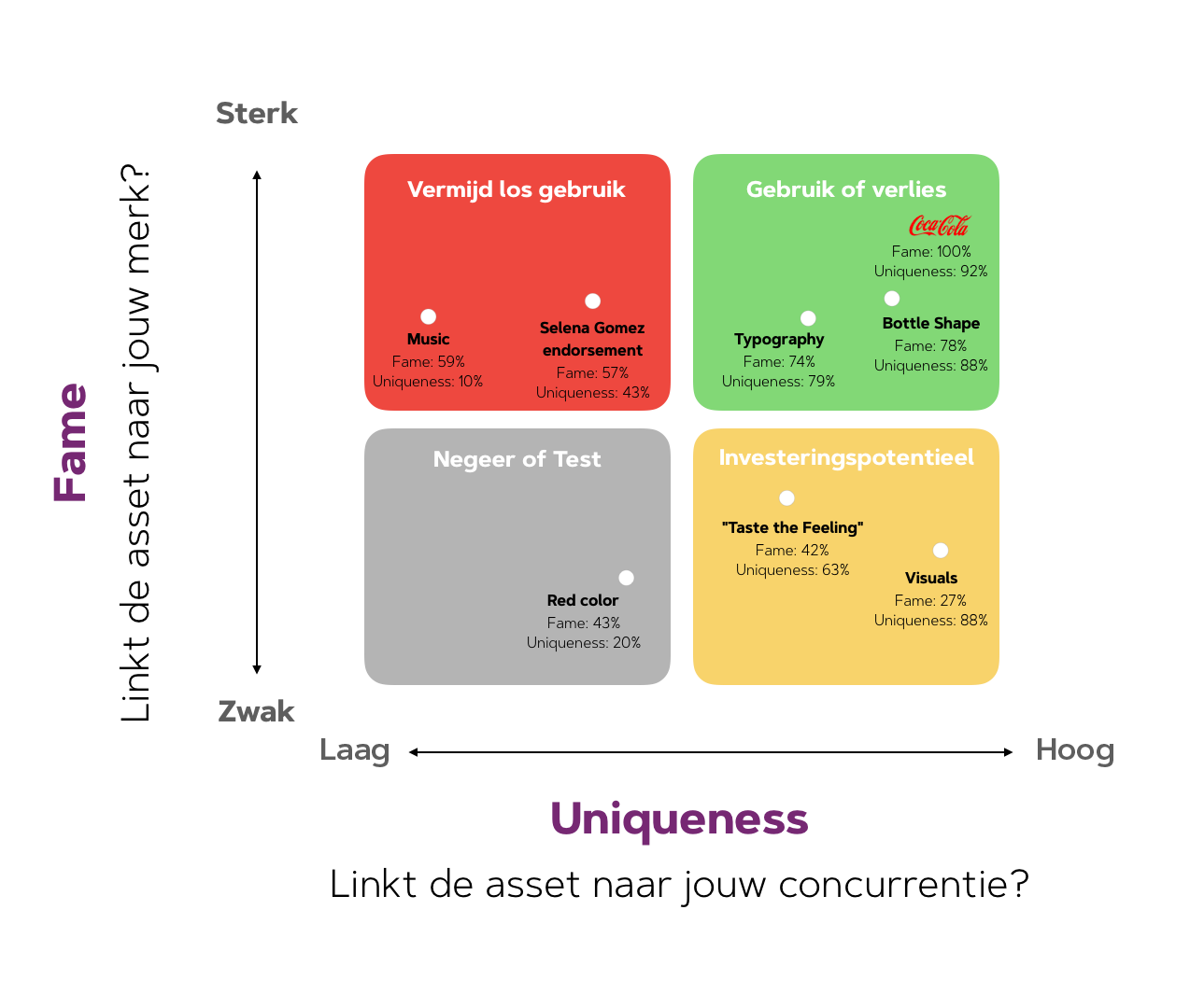 Onderzoek naar brand assets meet de respectievelijke score van elk item op Fame en Uniqueness.