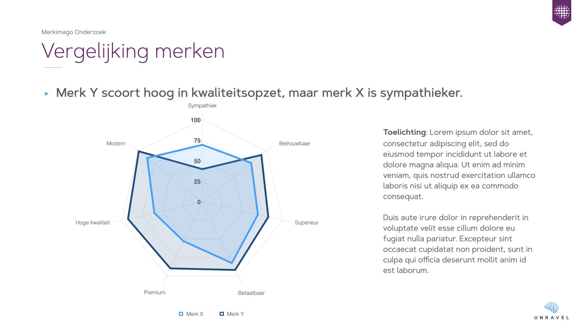 De ruwe reactietijddata wordt opgeschoond, individueel genormaliseerd en vervolgens getransformeerd naar performance scores op merkimago. Unravel speelt een actieve rol in de interpretatie van scores: wat zijn de implicaties voor marketing?