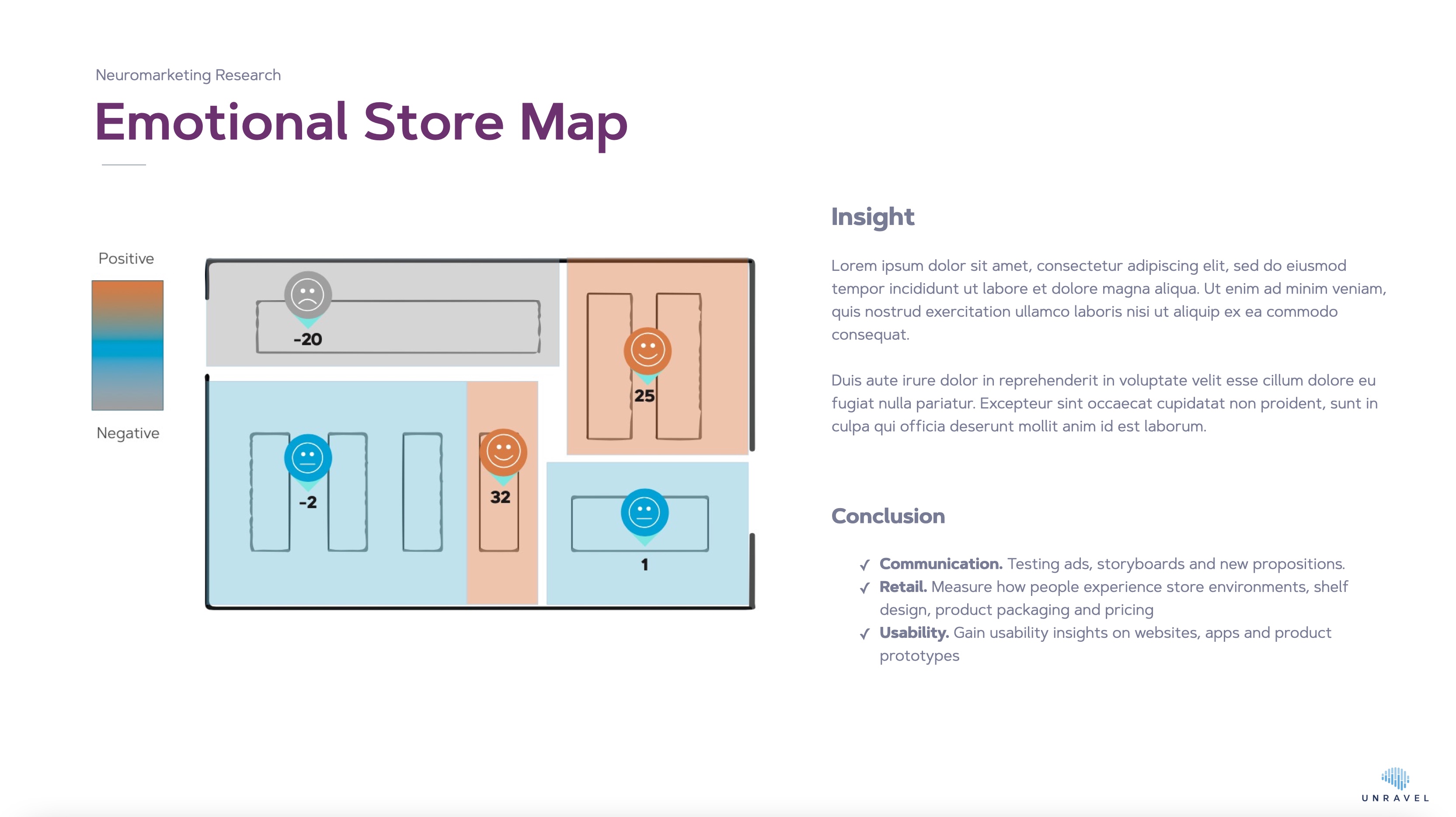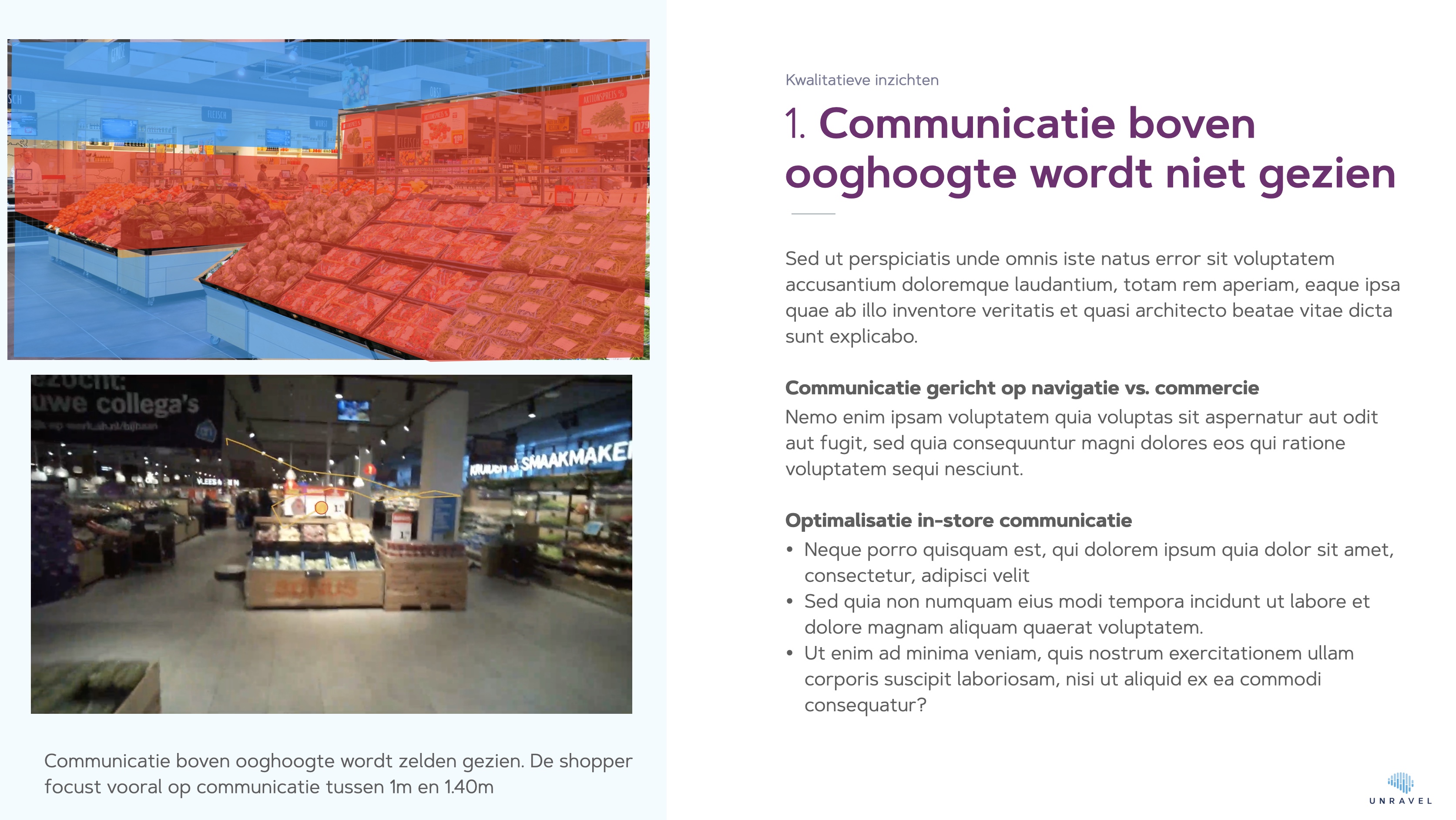 Unravel's in-store shopper onderzoek is de eerste methode die erin slaagt de nuances van de winkeltrip meetbaar te maken. Op een solide basis van Eye Tracking, die optioneel is uit te breiden met EEG (hersenactiviteit) en interviews verkrijgen we een ongekend compleet beeld van hoe de klant de winkel echt ervaart.