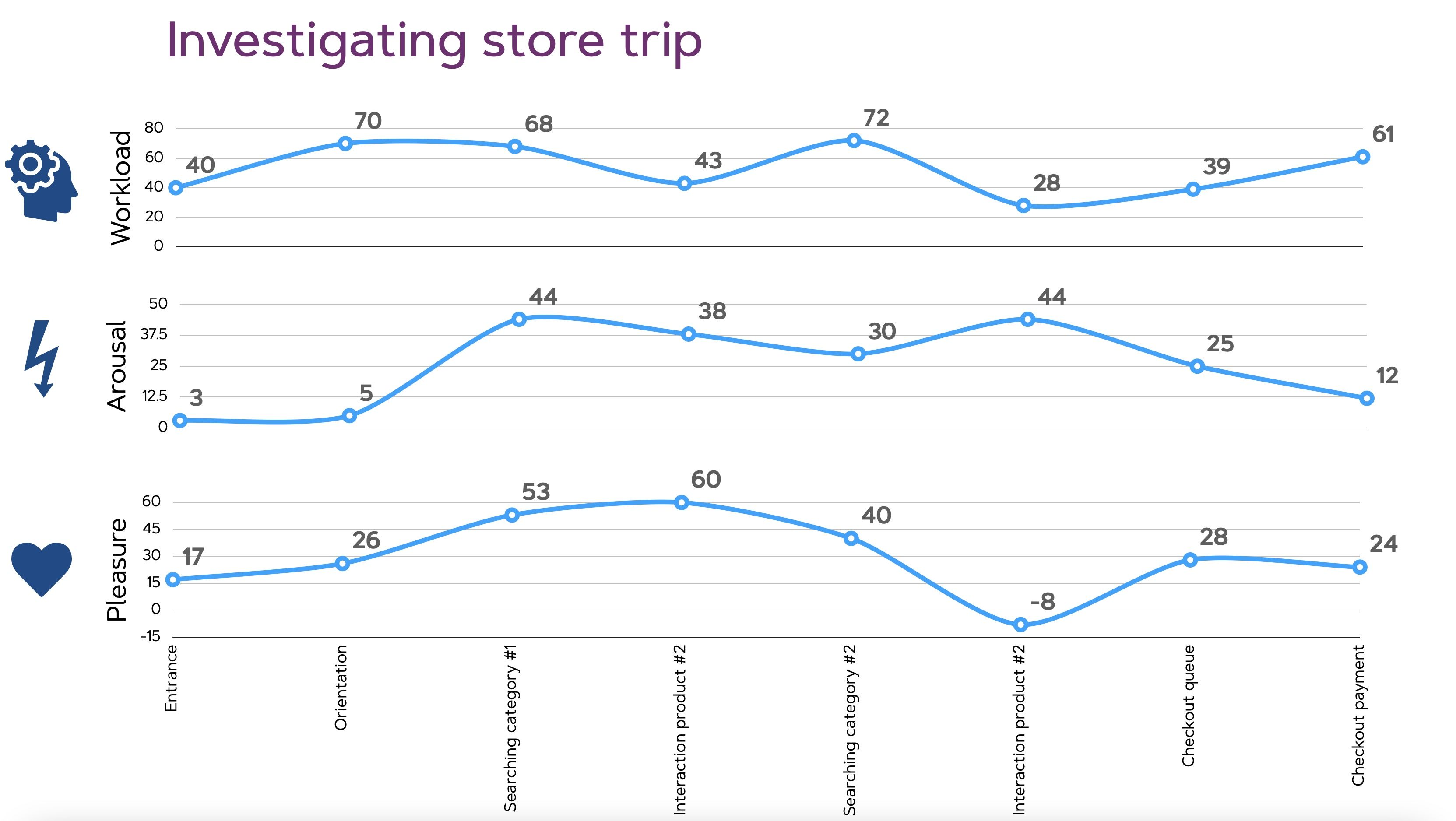 Hieronder vind je een voorbeeld van in-store neuromarketing onderzoek. De output levert enerzijds kwalitatieve inzichten op over de customer journey en mogelijke verbeteringen hierin (links) en anderzijds kwantitatieve data uitgesplitst per afdeling (midden) of tripmoment (rechts).