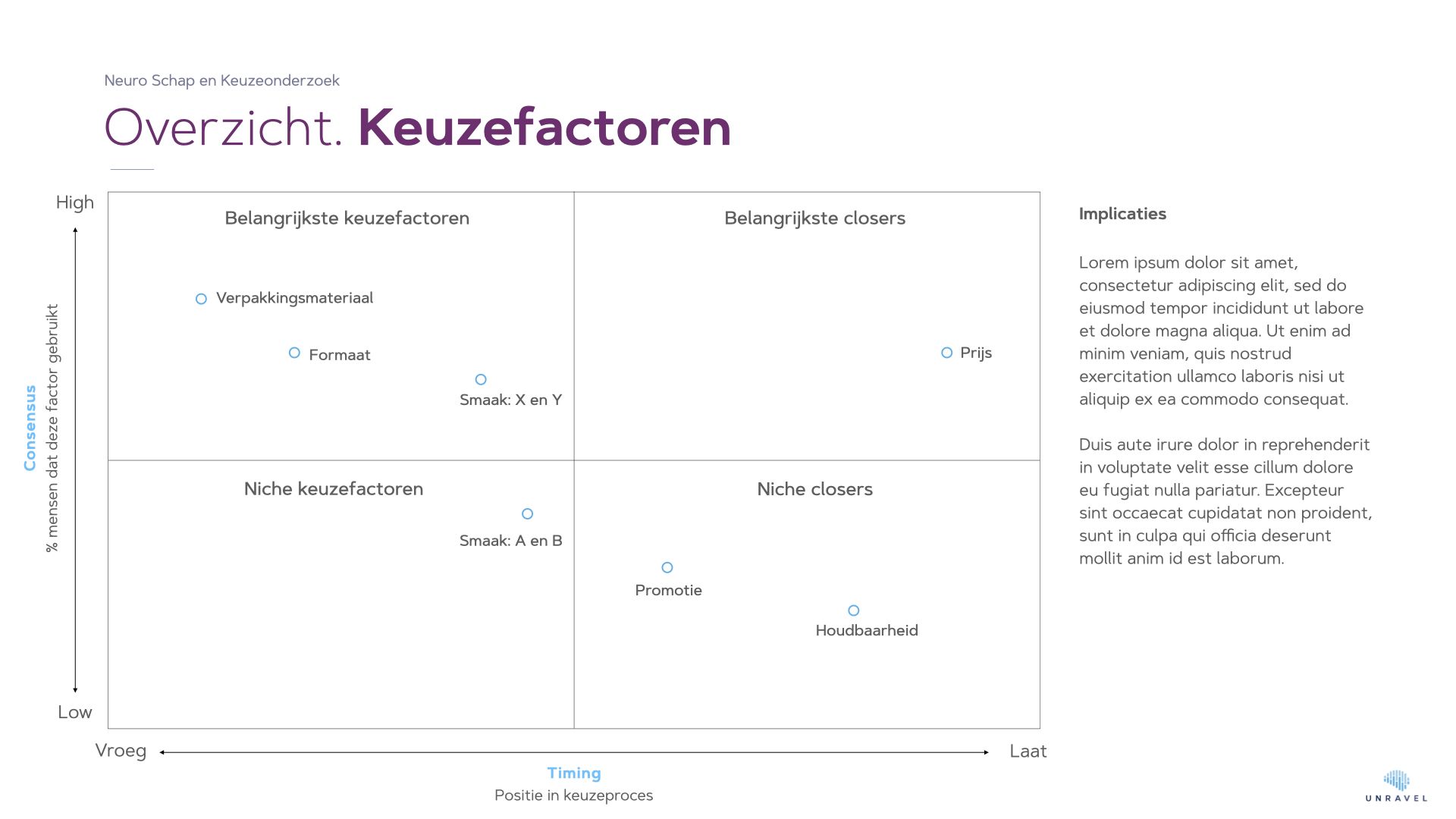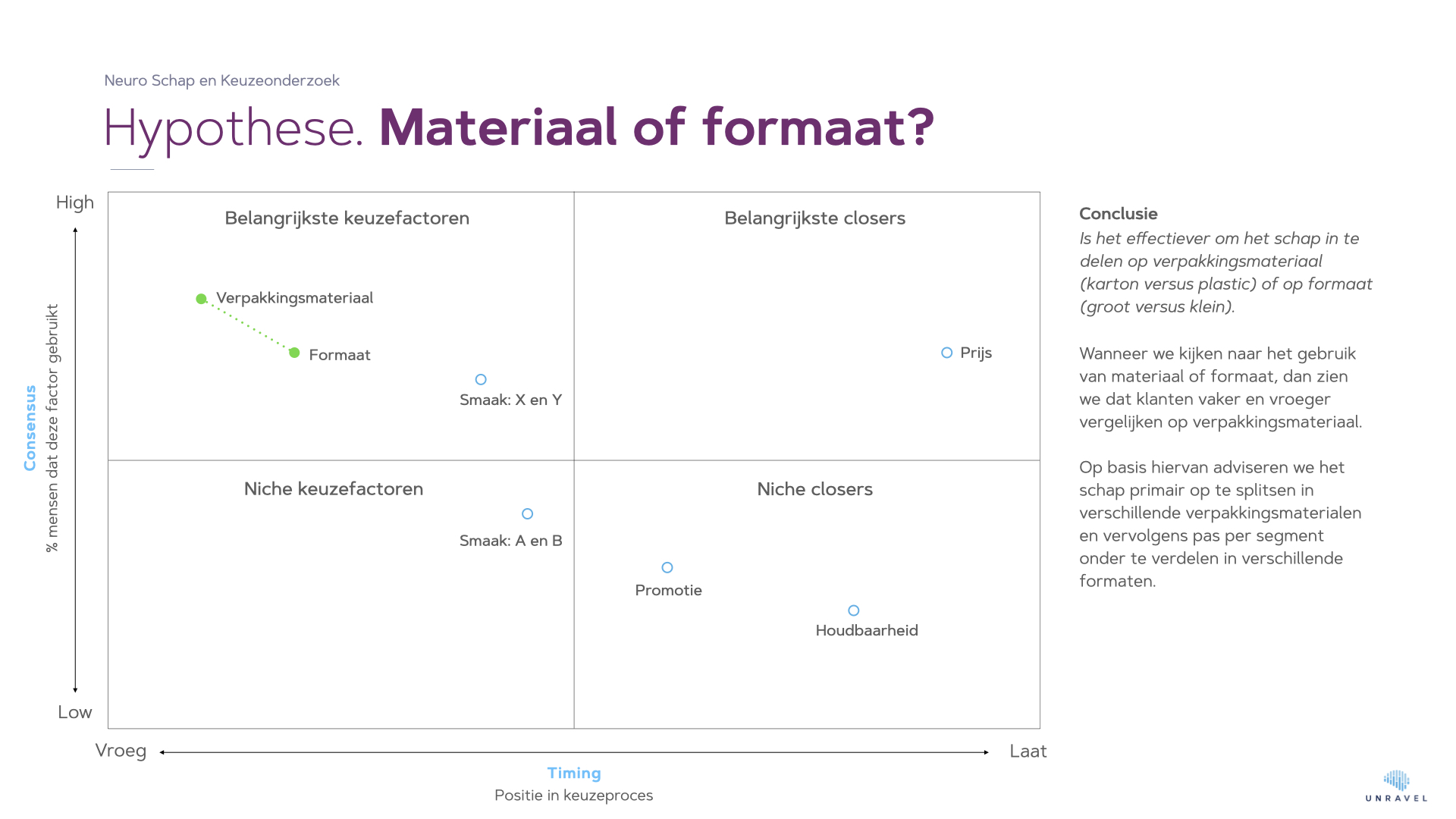 Elke factor word weergegeven in een keuzegrid. Op de y-as tonen we dominantie (% klanten dat de keuzefactor gebruikt) en op de x-as timing (vroeg of laat in het keuzeproces). Deze grid biedt een solide houvast bij schapindeling: veelal is het effectief om het schap in te delen op basis van factor die door veel mensen vroegtijdig in het keuzeproces worden gebruikt.