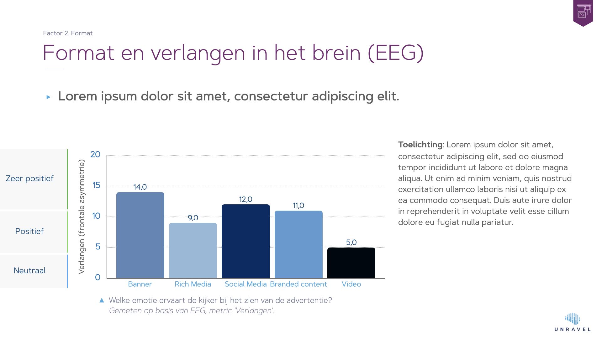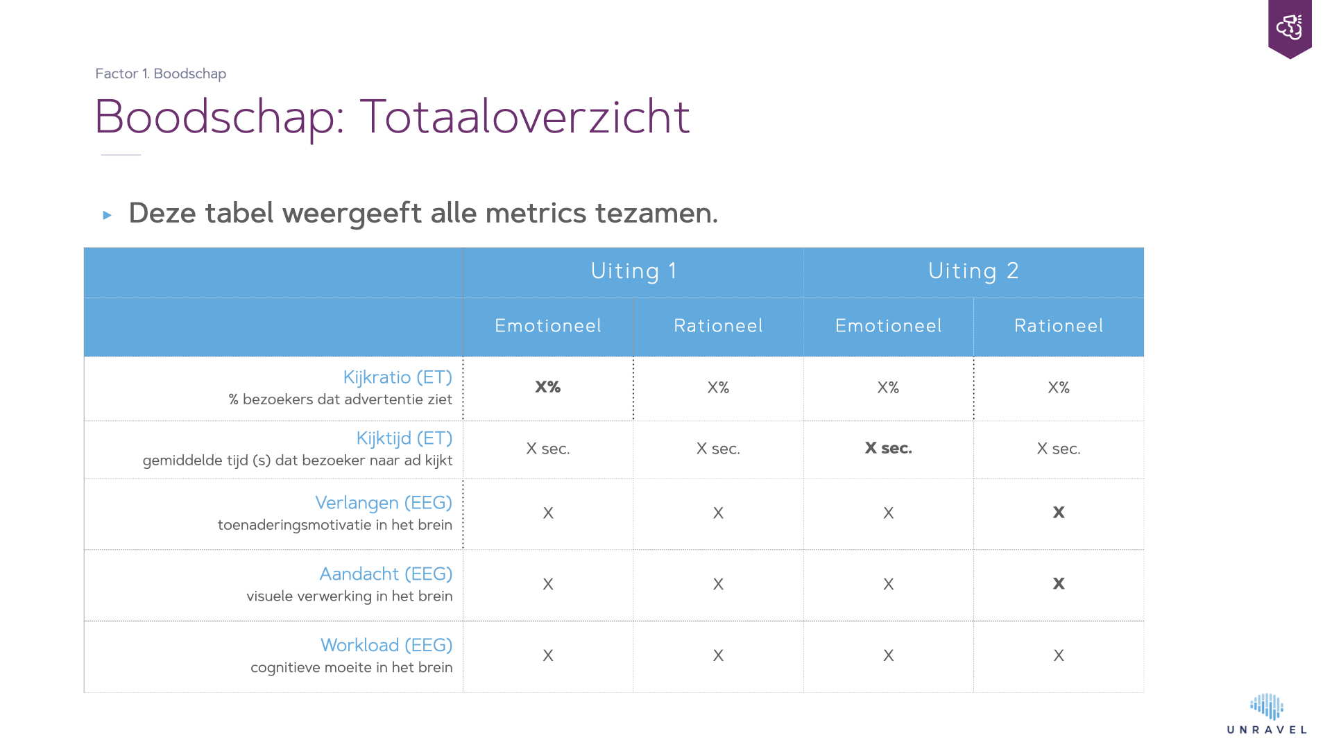 Door de performance van een communicatie-uiting te testen op de neuro KPI's kunnen we precies zien wat werkt en wat niet werkt. Op die manier krijg je praktische handvatten om de impact van jouw communicatie-uiting te verhogen.