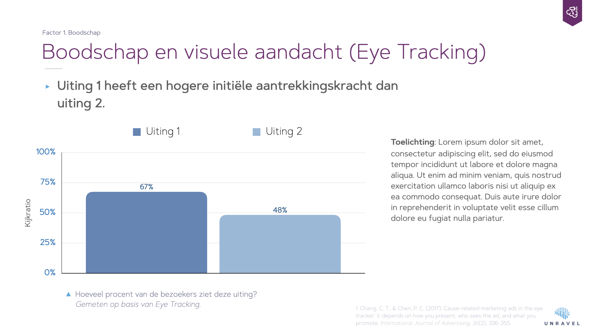 - Aandacht: Grijpt de uiting voldoende aandacht om de boodschap en het merk te communiceren? Welke elementen vallen op – en welke worden geskipt?