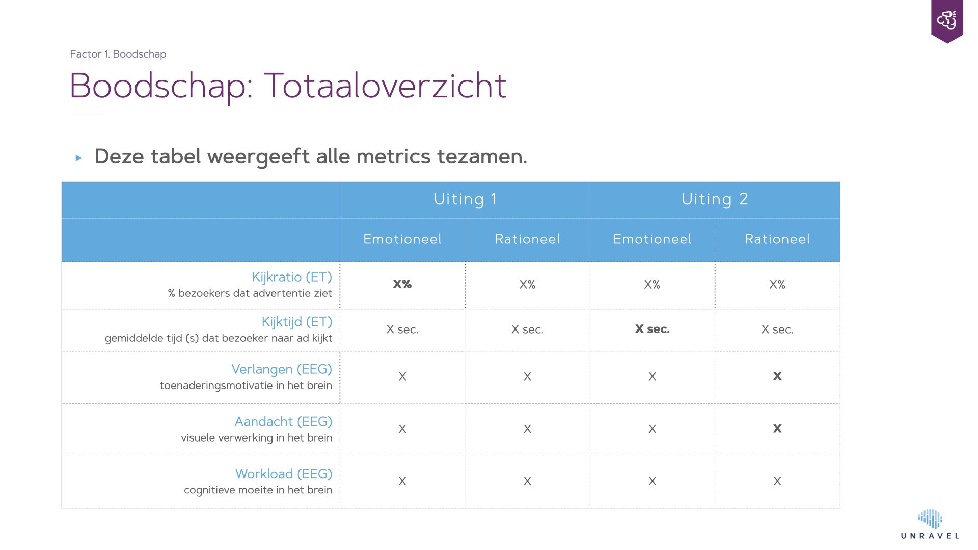Tijdens een communicatie onderzoek meten we de score van jouw uiting(en) op verschillende neuro KPI’s. De belangrijkste metrics zijn: