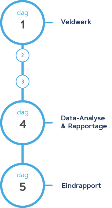 Het veldwerk vindt plaats gedurende drie dagen, waarbij we 20 respondenten testen. Communicatie-uitingen kunnen zowel stand-alone worden getest als meerdere versies naast elkaar.