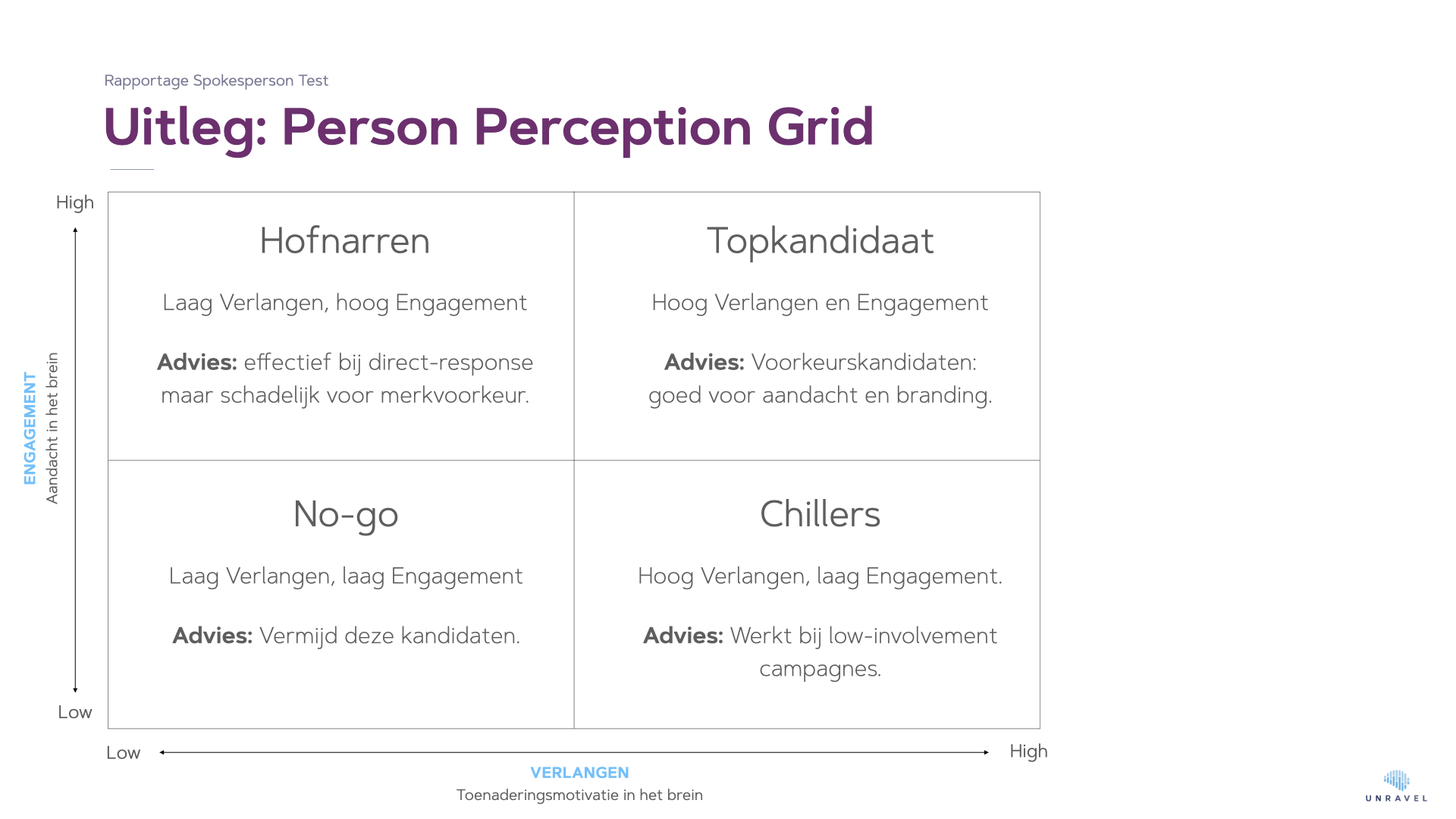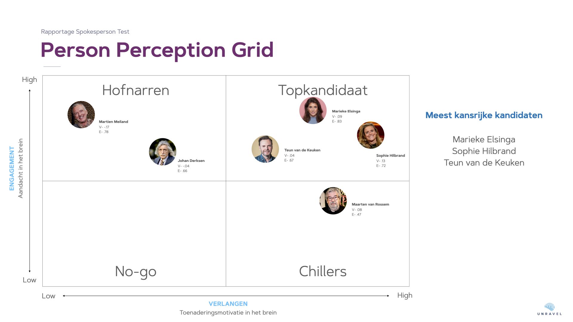 Deze twee factoren komen samen in Unravels Person Perception Grid. Hierin wordt elke kandidaat ingedeeld in één van de vier kwadranten: topkandidaat, hofnar, chiller, no-go.