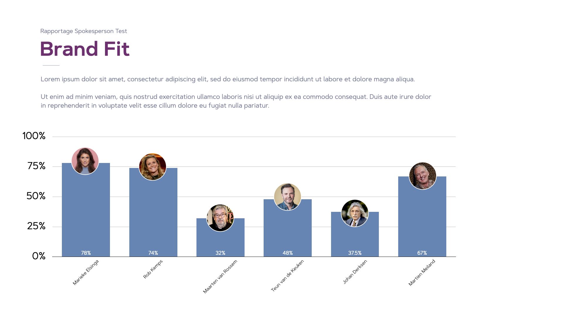 Anders dan een voice-over, zal een spokesperson zichtbaar in je campagnes verschijnen. Daarbij is het niet alleen belangrijk dat deze persoon goed de aandacht grijpt en positieve emotie opwekt, maar ook dat deze een goede fit heeft met je merk. Vooral wanneer het een beroemdheid betreft is goede brand-fit belangrijk.